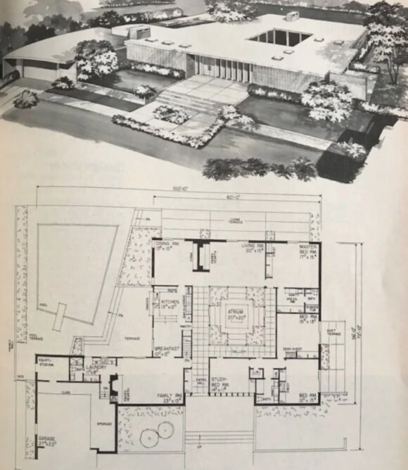 Built in 1962, this Modernist home in Los Angeles was designed by architect Carl Maston as his personal residence. Because of the steeply sloping site, the swimming pool had to be placed in the front—cleverly hidden from the street by a walled embankment.