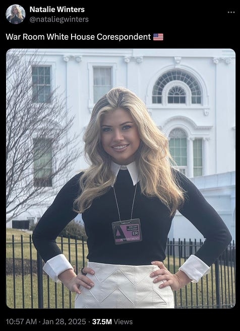 America, meet your new dumbed-down-as-fuckWhite House Press Corps. Donny’s press office has been doling out credentials to various wingnut noise machine randos — people like Natalie Winters, the co-host of one-man leper colony Steve Bannon’s War Room podcast. that’s right, Rotting Stevie Three-Shirts now has eyes and ears in the White House press room.