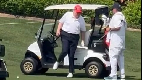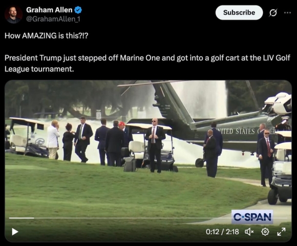“How AMAZING is this?!? President Trump just stepped off Marine One and got into a golf cart at the LIV Golf League tournament.”