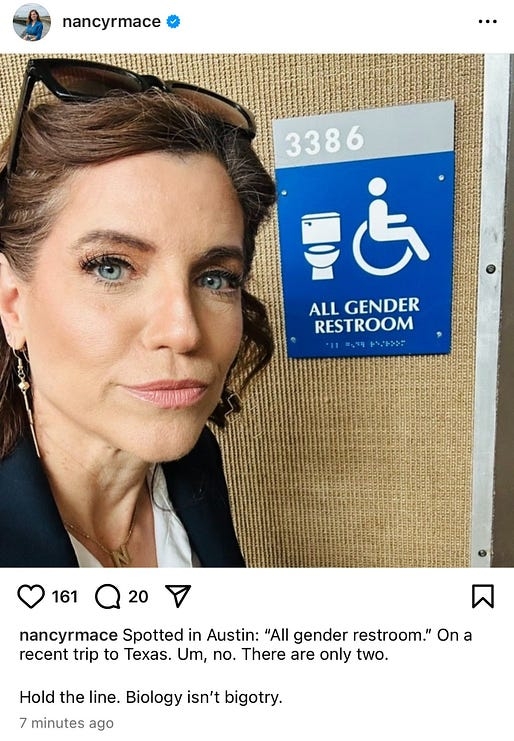 spoiler alert: yup, she maced herself — and not in the performative Nancy-Mace-beclowning-herself-in-front-of-a-unisex-bathroom way.