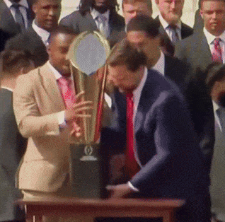 oh my god, JD — you had ONE JOB: picking up a championship trophy and handing it off to members of the Ohio State Buckeyes. but you couldn’t manage it without breaking the trophy in two and letting it fall from your stubby mitts.