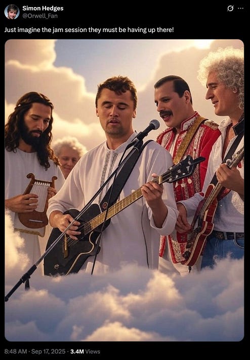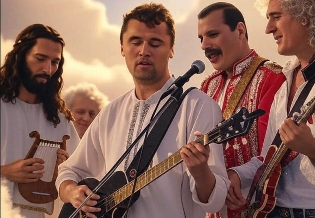 nonetheless, get ready to rejoice — because right now, Charlie Kirk is up in Heaven, fronting a band that I certainly hope is called Jesus and the 13 Apostles.