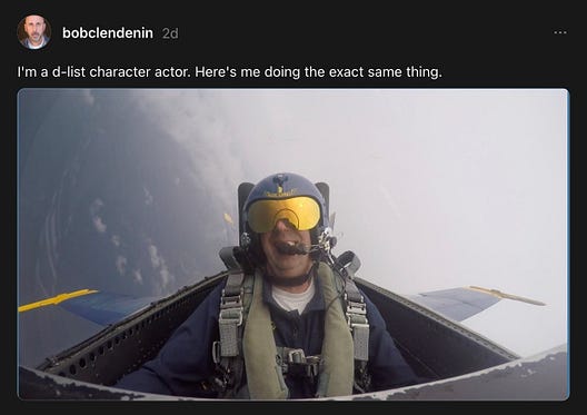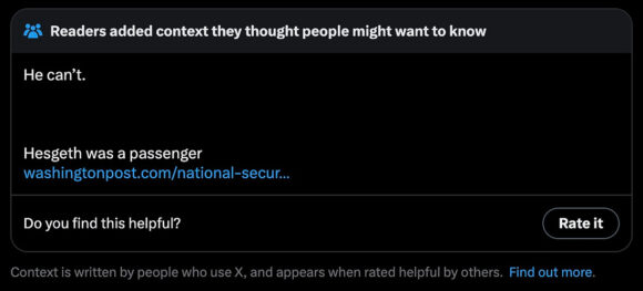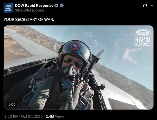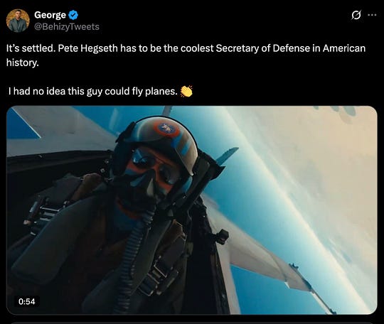 of course, the Department of Defense went out of their way to crop that video in a way that implied Piss-Drunk Pete was piloting that jet — because that’s what you do when your SecDef is a banty rooster with a paper-thin ego in need of constant affirmation that he’s something other than a two-bit Fox News weekend chat-show dunk-tank clown.