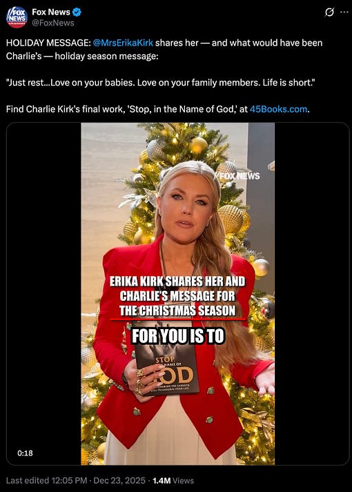 “HOLIDAY MESSAGE: @MrsErikaKirk shares her — and what would have been Charlie’s — holiday season message: ‘Just rest…Love on your babies. Love on your family members. Life is short.’ Find Charlie Kirk’s final work, ‘Stop, in the Name of God,’ at http://45Books.com.”